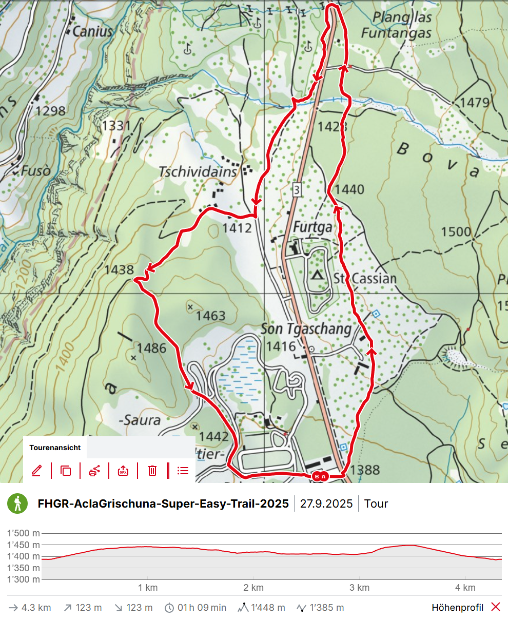 Der Acla Grischuna Mungga Trail führt im Bereich der Roland Arena über 4.3 Kilometer und +/- 123 Höhenmeter über gut befestigte Wege zum Teil durch das «Bual»-Gelände, wo im Winter auch die Tour de Ski ihre Loipen legt. Eine Strecke, die auch für alle startberechtigen Kinder gut zu bewältigen ist und die Lust auf mehr macht.